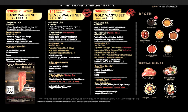 The three tiers start at $48 per person for basic and feature American and Australian wagyu, sushi and seafood. The silver tier is $58 per person and features Japanese A5 wagyu cuts, including wagyu tartare and wagyu bone marrow. The ultimate gold tier is $78 and has all of that, plus exclusive A5 wagyu cuts and other premium meat. (Some cuts are limited to one per visit.)